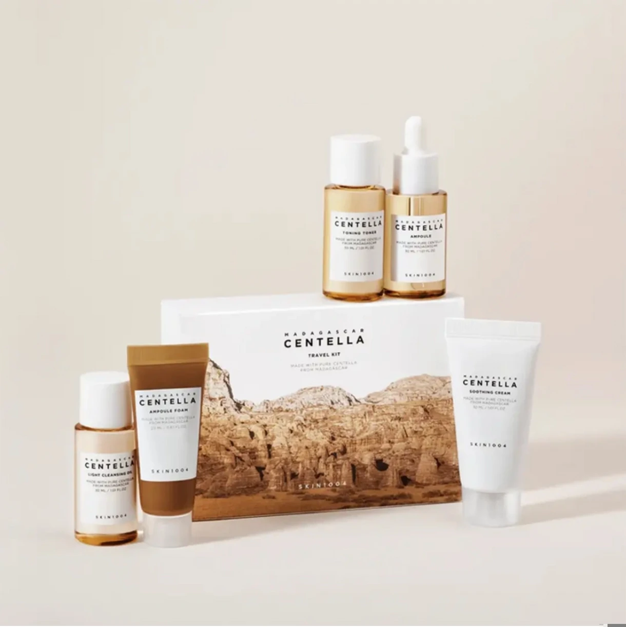 روتين عناية كامل من 5 خطوات بأحجام مناسبة للسفر يحتوي على خلاصة السنتيلا المنقاة من مدغشقر بـ 7 أضعاف المكونات